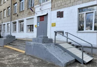 - центральный вход в школу оборудован пологим пандусом для инвалидных колясок, по бокам которого установлены перила и ограждающий бортик для предотвращения соскальзывания коляски.
