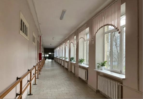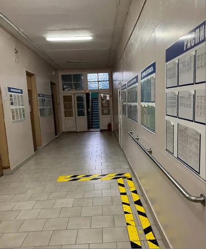 В медицинском кабинете хранится сменная кресло-коляска, предназначенная для временного использования внутри здания школы учащимися с нарушениями статодинамических функций. Передвижение на коляске осуществляет педагог или тьютер. Коридоры по всему периметру 1 этажа оснащены поручнями для удобного передвижения на инвалидных колясках и с тростью. Направление движения показывает тактильная желтая разметка.